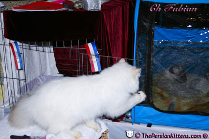 Persian Kittens © CH Fabian knocking on the carrier of the female cats benched next to us, such a Playboy !