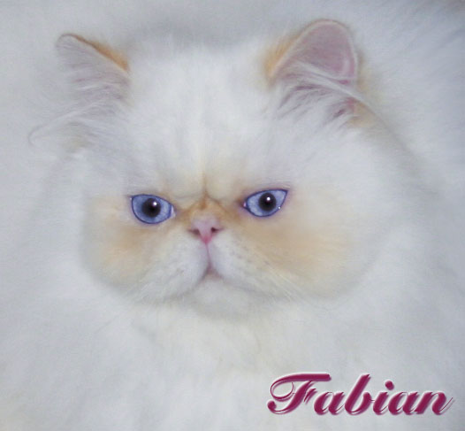 Persian Cat Fabian is a Male Flame Lynx Point Persian Himalayan Kitten. CH Fabian was the fourth kitten born at 5:20 am and weighed a 84 grams. CH Fabian wil be a small kitten and weigh of 5~6 lbs as a full grown persian cat. CH Fabian was such a surprise! Petulia was all settled in and nursing her three kittens when all of a sudden, with one big contraction, CH Fabian came. A very welcomed surprise. CH Fabian was such a beautiful newborn. CH Fabian purrs as she nurses She has her mommie’s Petulia’s cute face and turned up nose. CH Fabian is a talker kittie. She will let me know when she wants to be closer to me than the other kittens. She’ll lay stretched out on her back, and I will let me eat up her belly, she loves it. As soon as I touch her she meows. CH Fabian is a very alert, confident kitten. CH Fabian has a very outgoing personality! CH Fabian is The Princess of the house. She sits like a Princess, and walks like one with her tail high in the air with her cute legs rubbing against each other because her fur is so thick. CH Fabian loves to be the first to greet people when they come over. She walks in and around their legs. Then when they sit down, she will jump in their lap.CH Fabian likes to sleep on top of me. CH Fabian’s fur is so soft it’s like petting a chincilla, it’s so beautiful. CH Fabian’s eyes are big & bright like a shining blue crystal gem !