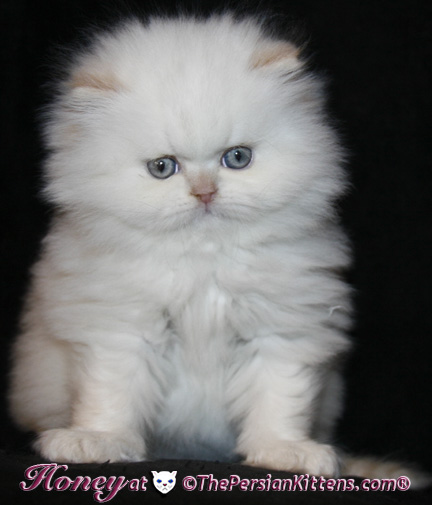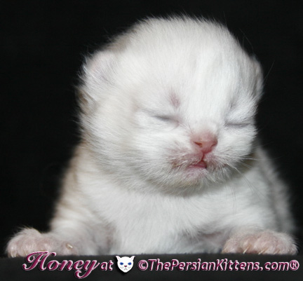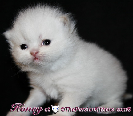 Persian Kitten Honey is a male Cream Lynx Point Persian Himalayan Kitten. Born at 7:15 am and weighing a healthy 105g. Honey will be a small persian cat and will weigh 8~11 lbs. Honey wants to walk around, and can lift his head, he is a strong boy. Honey is determined to explore his new little world. Honey is a very spunky kitten, and can walk without his belly rubbing on the ground. Honey loves to be picked up, and kissed, he makes the cutest meows when I do. Honey loves to be touched. Honey has learned how to climb into bed with me. He comes by and licks my face and purrs. His cute round face and small ears, he will be gorgeous and he will look like both his parents! He will have huge Electric-Sapphire Blue eyes, that against his white fur will be outrageouly gorgeous! Honey will look like Rexx & Maxx .
