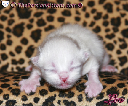Persian Kitten Leo is a male Cream Point Persian Himalayan Kitten. Born 9:27 am, Leo weighed 116 grams~ a very healthy weight. Leo is already an explorer, wanting to know what’s around him. Right after birth, he was sniffing and trying to navigate his new world. Leo will look just like his Daddy CH Maxi, Maxi Jr, Angel, Desi Rudy, Mojo, and older sisters Maxim and Priscilla. Leo will weigh @ 9-11 lbs. full grown.Leo has a nice sweet round face, purrfect proportions, and LOVES kisses!