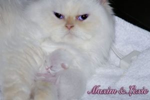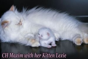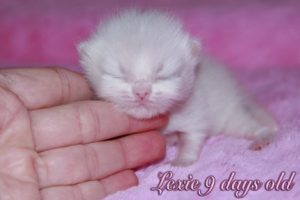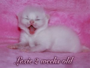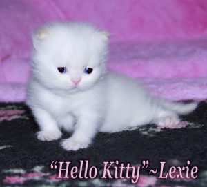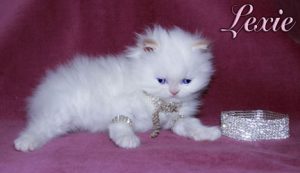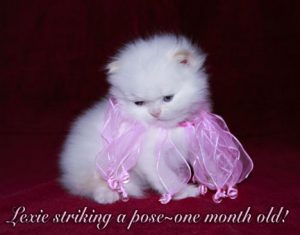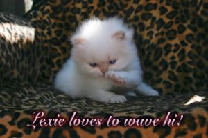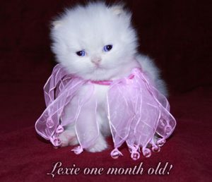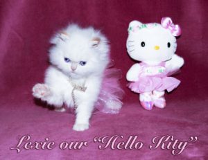 Lexie is the only kitten born to CH Maxim and CH Rexx on August 14, 2008 at 11:22 am. She was a very healthy, petite 70 grams at birth, our smallest kitten ever! Although ultra petite, Lexie has a great appetite-like all The Persian Kittens®. She gets along with everyone. She’ll play, groom and sleep with the kittens born Sept 7, and with her Uncle Rocky, & Auntie Priscilla. Lexie tries to play and chase her mommie Maxim, it’s so cute to watch. She follows and does everything the big cats do! Lexie is amazingly secure and smart for such a small kitten. Lexie is a cream lynx point female. She has very pretty features and looks like a purrfect little Hello Kitty. Lexie will be a petite version of her Mommie CH Maxim.with big blue eyes that all our kittens have. Watch this cute Video (coming soon) of Lexie first steps & Lexie doing High Fives, She’s a real life Hello Kitty!