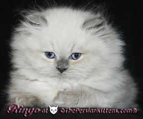 Persian Kitten Ringo is a male Blue Point Persian Himalayan Kitten. Ringo had very healthy birth weight, weighing 100g, and are nursing constantly growing stronger every day. Ringo born was born at 10:55 pm arriving without complications. Ringo wil be a Med small male kitten and weigh of 9~10 lbs full grown. Ringo took his time being delivered, but as soon as he arrived he was ready to walk and nurse! Ringo purrs as he nurses Ringo has his daddy’s CH Maxi’s cute face and turned up nose. Ringo is already a talker. As soon as I touch him she meows. Ringo is a very alert confident kitten. Ringo has a very outgoing personality! Ringo is fighting & running around with Oliver an older kitten from another litter, he is a tough little boy. They play fight and climb the scratch post. Ringo likes me to pick him up and kiss him and pet him. Ringo will grow to have the Champion winning looks of his Daddy CH Maxi. Ringo’s eyes wil be big & very deep sapphire blue, against Blue Pointed thick glossy fur with a thick mane like his Daddy CHampion Maxi.