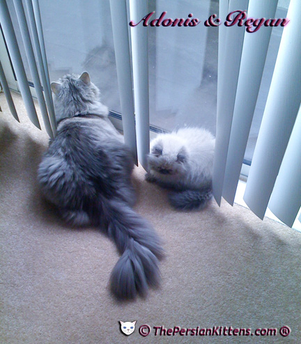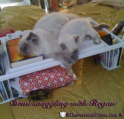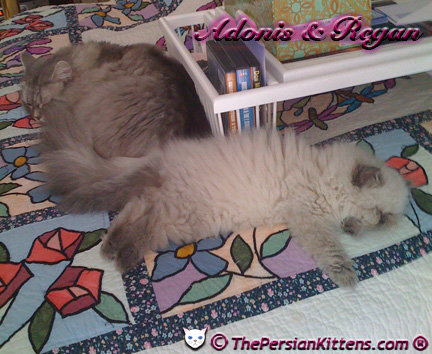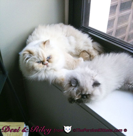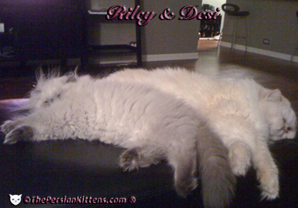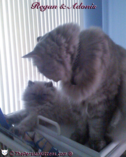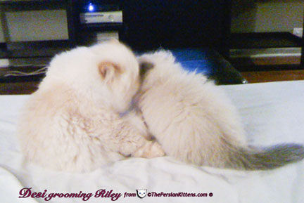 Persian Kitten Desi now 1.5 years old immediately accepted Riley, and they are inseparable. Desi has taken on the big Brother role very well, and watches and grooms his little brother Riley. Too Adorable.Raquel has two of The Persian Kittens® best boys!!!
