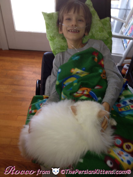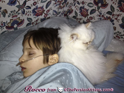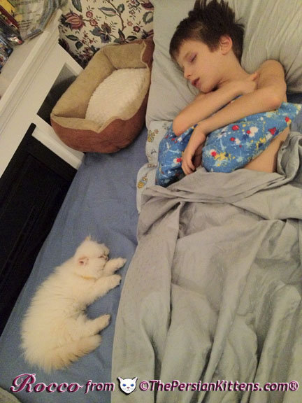 Rocco is everything you promised: a sweet lapkitten that also sleeps in bed with us. I never possessed a cat for a pet as I was always allergic to them and had no particular interest in them. But since my 7 year old son has to now live in a wheelchair, we thought a cat should be a good companion for him. My son and I have no allergic responses to Rocco to my relief. I am so in love with Rocco and can’t believe I could ever love a cat at all. Rocco is so precious and I consider him to be the best kitten anyone could ever ask for. I am loving him more and more every day.