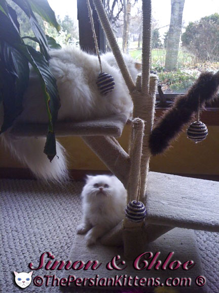 Thank you so much for keeping in such good contact since little Simon has been in his new home! I know I have been calling you with a 1,000 goofy questions so thank you for being so incredibly patient and answering all of them…it has helped me so much being a first-time kitty mommy. He is doing excellent!! Running around, we play together almost nonstop, he’s a ball of energy and my little prince! I never thought adopting one of your gorgeous kitties would be this amazing…I am soo glad I ran into your website, and had the chance to meet you and your kitties in person! Right away I knew I had made the right decision! Simon sleeps right by my head every night…my mom calls him the purr monster because all you have to do is call his name or touch him and immediately he lights up and purrs like crazy! Thank you for all his paperwork, its all very neat inside the folder you gave to me, I will send out for his kitty birth certificate asap! Again, thank you so much I will definately reccomend you to anyone looking for a gorgeous sweet persian kitty!