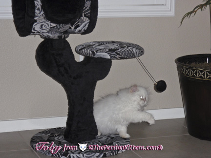 Toby is the most playful and sweet baby. He loves that cathouse, he stands on top and just goes crazy. Toby is a precious kitten. He is playing with all his toys and follows us everywhere. He has a great appetite and is doing great. He purrs non stop and loves to play, we are so very happy we have him. Thank you for an amazing kitten.