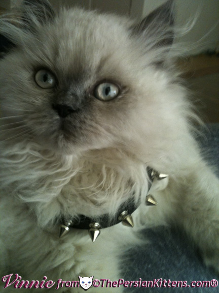 Here is a pic of Vinnie I took yesterday with a very bad ass studded collar. Of course, it was way too big on him, but he kept it on long enough to let me take pictures. I thought it would be a good one to begin a Vinnie proud owners page with. He is such a good little boy, I know I keep saying it, but what an outstanding personality he has. My neighbor, who also has a 5 year old persian, fell in love with him! He’s a charmer! He had a little raw salmon tonight and loved it! Ate everything and licked the bowl clean. He has a little issue with diarrhea right now, but I think he was just stressed from everything in the past two days, so I backed off his canned wet food, and gave him the salmon and dry kitten food, so I will watch to see how he does. Anyway, take care for now…Vinnie says hi!