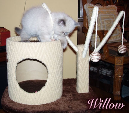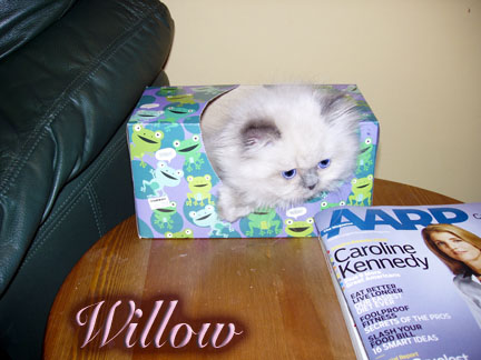 willow is doing great. he spent the whole 1st day exploring everything, but now he just loves playing and cuddling and especially being in his kitty condo. as u can see we love him soooooooooooo much, in the morning when i got up for work he got up too and was ready to play, before i left i put him in bed with my mom and she ended waking up with him sleeping on her head lol. in one pic u can see he got into a a tissue box and used it as a nap spot..we took him out shortly after he got in but it made a cute pic. be sure that we love him very much and well def keep updated on him…