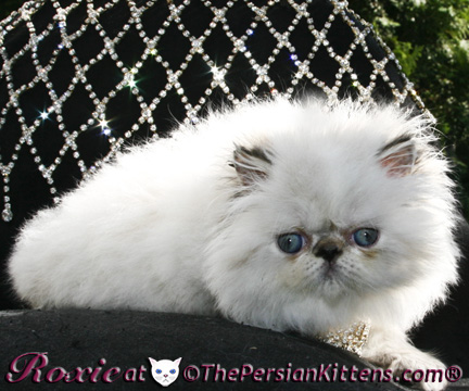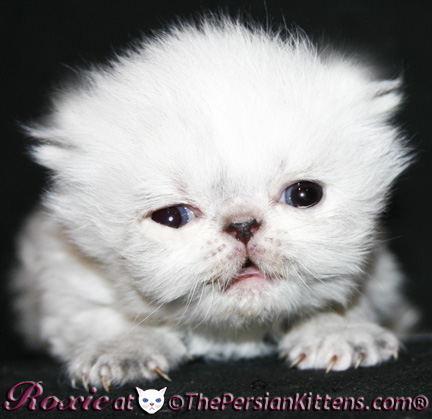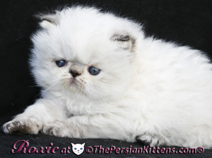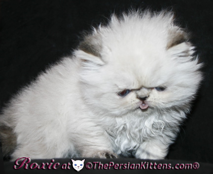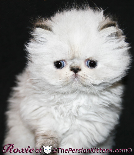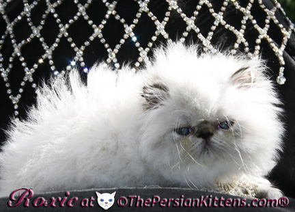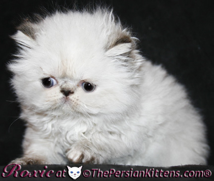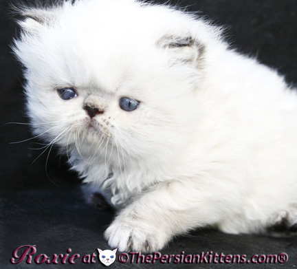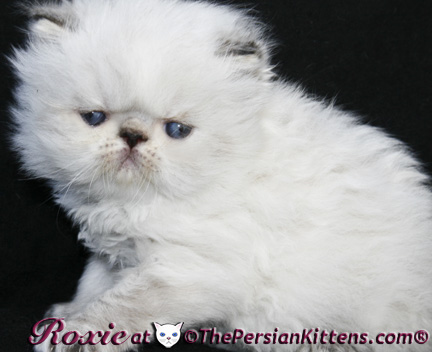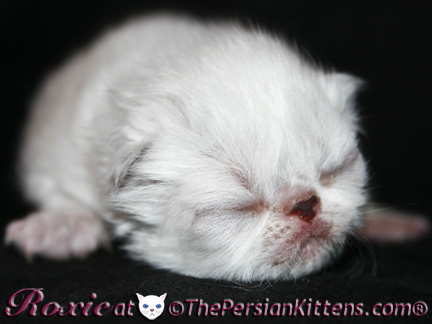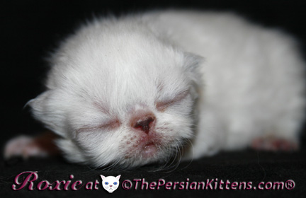 Persian Kitten Roxie is a female Lilac Cream Point Persian Himalayan Kitten. Her body will be white, and her Points (tips of ears, nose, featering through the tail & her paws) will have the Lilac Cream color. Roxie is the second kitten born at 2:30 pm and weighed a healthy 91 g. Roxie has her daddy’s CH Maxwell’s cute face and turned up nose. Roxie is active & likes to explore, and crawl around the room. Roxie is the first to to put her little head for kisses & purrs. Roxie purrs while she nurses, it’s such a little purr and very cute. Roxie is a very sweet & confident kitten. Roxie is very talkative, as soon as she was born she was talking!!! Roxie will grow to weigh a petite @ 5 lbs. She will have the Champion winning looks of her Daddy CH Maxwell, but will have her mommie’s coloring, a white body and lite cappuccino touches of color on the tip of her ears, nose,and hers tail.