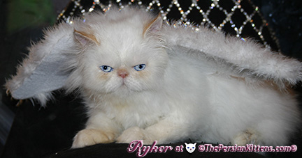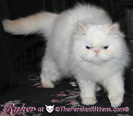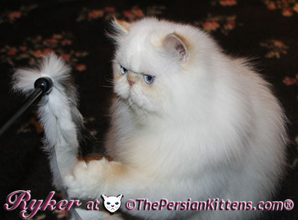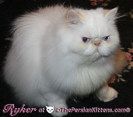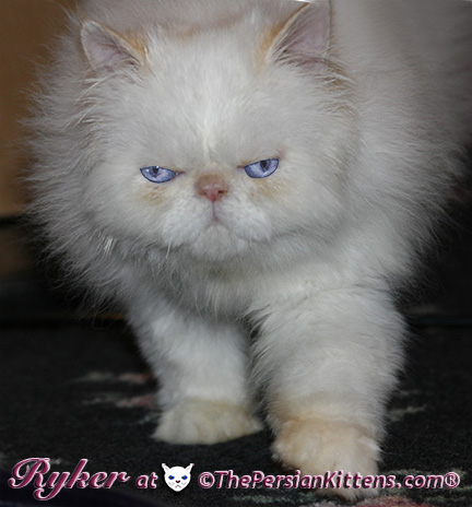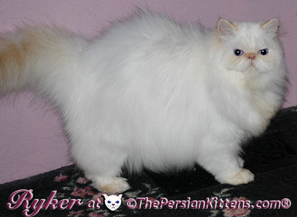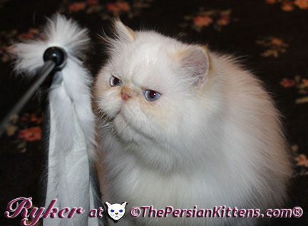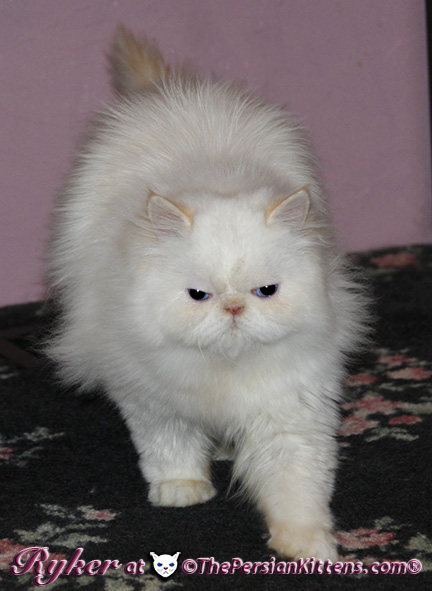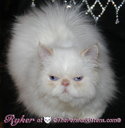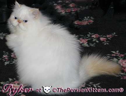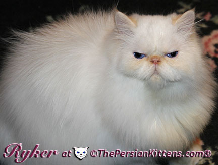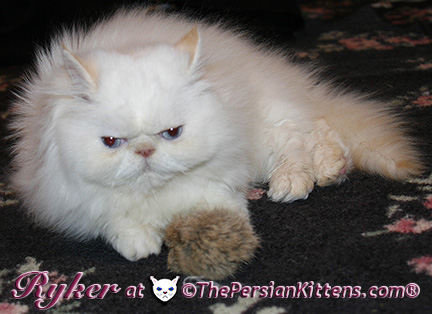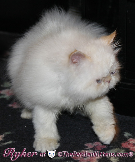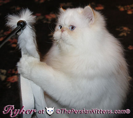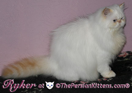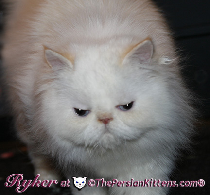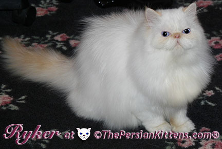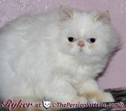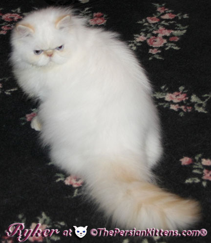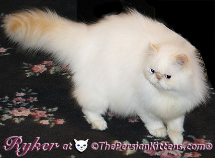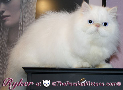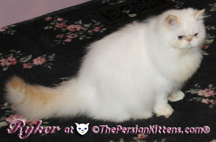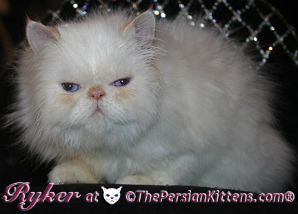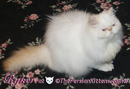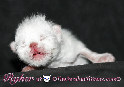 Persian Kitten Ryker is a male Long Hair Exotic Cream Point Exotic Persian Himalayan Kitten. Ryker was the second born at 3:30 am, and weighed a tiny 68 grams. He will weigh 8~11 lbs. as a full grown persian cat. He was a very tiny weight. However when he latched onto a nipple that was his. It was Petulia’s biggest nipple! He wil be a medium persian cat @ 8~10 lbs. Ryker will look almost pure white like his CH Daddy Maxwell. Ryker is already sweet and likes my kisses, and will suck on my lip. He loves his mommie and meows when his mommie Petulia grooms him. He is a happy, playful kitten. He is so sweet and purrs while he nurses. He likes me to rub his belly. Ryker was the first kitten to climb the pet stairs next to my bed. When he made it to the top and saw me he had the cutest look on his face and immediatelty came over to me and gave me kisses. From then on he sleeps next to me. Ryker is a very playful kitten. Even when I pet him, he purrs and grabs my hand with all his paws and rolls around, it’s very endearing. It’s amazing that Ryker was such a tiny kitten, because now when I ‘m in the basement sitting and cutting up the chicken breast, Ryker eats the pieces faster than I can cut it. Ryker has his mommie Petulia’s face and pretty big blue eyes & will have his daddy’s CH Maxwell’s thick soft fur. He will be gorgeous & very fluffy white! Ryker’s Grand Fathers on both his Mother’s side, and his Father’s side are Grand Champion and Regional Winners! Ryker will look like Rexx, & Dale.