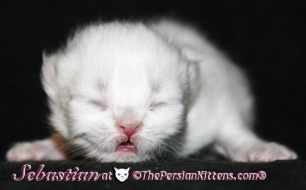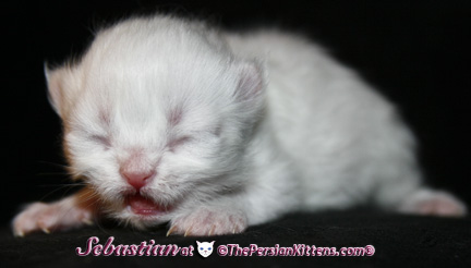 Persian Kitten Sebastian is a male Cream Point Persian Himalayan Kitten. Sebastian was the third born at 8:33 am, and weighed a healthy 105 grams. Sebastian is the one of the bigggest of the boys, and will grow to be 10 ~ 12 lbs full grown. Sebastian is a very active and curious little boy, he is also very laid back. He likes to be held. I will put him in the palm of my hand and kiss his belly he loves it and he meows! He is spunky little boy. Sebastian loves to cuddle, he cuddles up in my neck and falls asleep. He is a very playful bright kitten. Sebastian has big paws like his Daddy CH Fabian. Sebastian has a very cute and very round face-and wide set ears. He will be beautiful and look like his Daddy CH Fabian! He will have Electric-Sapphire Blue eyes, that against his thick glossy white & cream points in his fur will be outrageouly gorgeous!